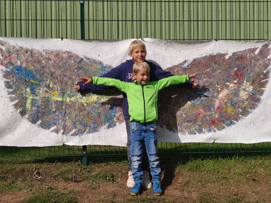In einem Kunstprojekt haben Hortkinder der 2. bis 4. Klasse im September riesige Flügelpaare auf Leinwand gemalt. „Wir.Machen.Kunst“ war das Motto der Aktion, an der sich unter Leitung von Tina Kossow mehr als 20 Mädchen und Jungen in vier Workshops beteiligt haben. Mit Schrubber und Besen, Pinseln, Softbällen, alten Schuhen, Autoreifen, Skateboards, Fliegenklatschen und einigen anderen Utensilien haben die Kinder mit großem Eifer viel Farbe auf insgesamt 15 Meter Leinwand verteilt. Für die Hortkinder war dies ein Riesenspaß und die Ergebnisse können sich unbedingt sehen lassen. Stellt sich jemand vor die Flügel, findet der Betrachter einen spannenden Perspektivwechsel. Am 22. September wurden die entstandenen Flügelbilder Kindern, Eltern und ErzieherInnen auf dem Schulhof vorgestellt. Die kleine Ausstellung wurde von Sprüchen zum Thema Flügel und Fliegen begleitet, die die Kinder auf dem Hort- und Schulgelände verteilt hatten. Begeisterung bei allen Zuschauern. Nun kommen die jungen Künstler ganz groß raus!